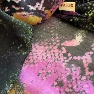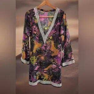 Eye-catching dress with a V-neckline and multicolor pattern. Features purple, yellow, and black hues with glass beads trims.