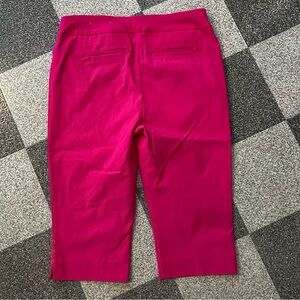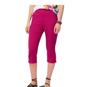 Sleek crop ponte capris in a vivid fuchsia hue. Smooth pull-on waist for easy wear. Slim, flattering cut that hits mid-calf. Versatile for casual or dressed-up outfits.