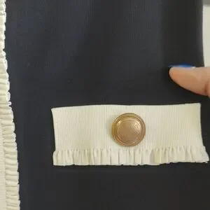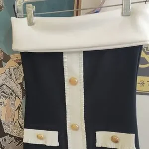 Zara , chanel inspired beautiful dress! very elegant, slimming stretchy material! very flattering! Chic off-shoulder dress with a white fold-over neckline. Center white trim with gold buttons and matching pocket accents. Sleek, structured silhouette. Elegant and timeless.