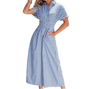 A crisp blue striped jumpsuit with a tailored waist and short sleeves. Features button-front closure and convenient side pockets. Lightweight and versatile for everyday wear. Blue stripe adds a fresh, classic look.