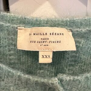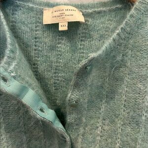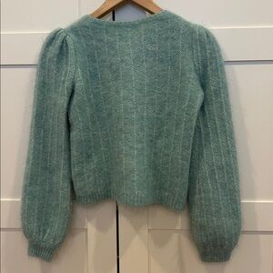 A sweet cardigan with delicate details like matching buttons, scalloped edge and gathered sleeves in a sea green color. Like new.