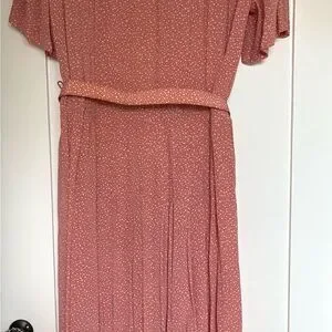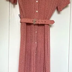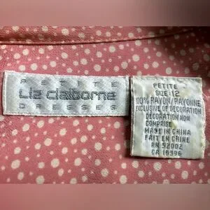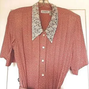 Charming pink-peach Liz Claiborne floral dress with detachable belt. This pink-peach floral dress has cream accents featuring a delicate lace collar and gorgeous buttons down the front. Perfect for a vintage-inspired cottagecore look. Good vintage condition with light discoloration along the neckline to tag as pictured. No other stains or discoloration marks to the outside or flaws that I see. This dress has been well maintained in selling for its original owner (not thrifted).