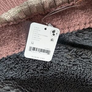 Cozy ribbed knit pants with wide-leg silhouette. Horizontal stripes in brown, blue, cream, and tan. Soft stretch waistband for comfort. Stylish casual look for layering.