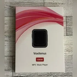 Voxitenus 128GB MP3 music player packaging. Clean white box with pink and red wave graphics. Modern compact player shown on front. Great for music on the go.