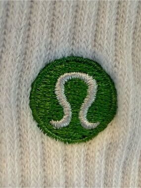 Soft white crew socks featuring two green lululemon logos. Ribbed cuff for secure fit. Cushioned foot for comfort during activity. Versatile for everyday wear or workouts.