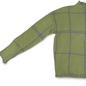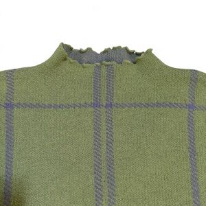 Light green and gray plaid mock neck sweater with lots of stretch. Cute scalloping detail around the neck. Size S with an oversized fit and stretch. Unsure of brand, tag removed.