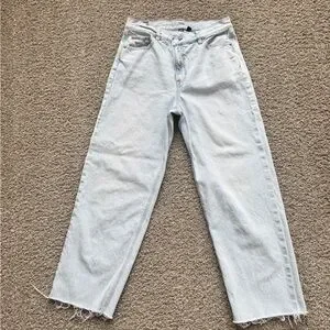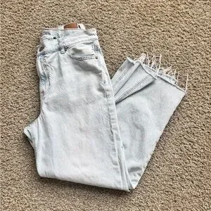 Light wash American Eagle Highest Rise Baggy Straight Jean with distressed hem. I LOVE these pants but they’re unfortunately too big for me. They have a slight cross over waist band.