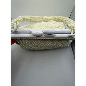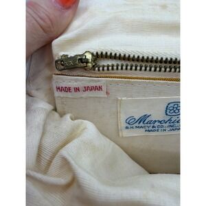 Vintage Marchi for R.H. Macy & Co. beaded handbag crafted in Japan. This elegant evening bag features a creamy white exterior adorned with intricate seed bead work in a geometric diamond pattern. The structured frame is topped with a white plastic kiss-lock clasp and includes a matching beaded top handle. Inside, the bag is lined with a light fabric and contains a single zippered pocket with a vintage metal zipper. Perfect for weddings, formal events, or adding a mid-century touch to a modern outfit.
