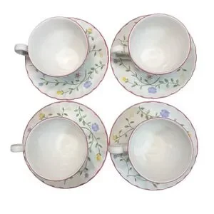 The product is a set of 4 Johnson Brothers Summer Chintz teacups and saucers, totaling 8 pieces. The multi-color design with an English style is perfect for serving tea in the summer. Made of fine bone china with a chintz production style, this set is both stylish and elegant, adding a touch of sophistication to your tea time. Perfect for entertaining or everyday use, these teacups and saucers are a charming addition to any table setting.