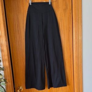 Floaty wide-leg silhouette with a high-rise waistband. Smooth stretch fabric for easy movement. Sleek black finish for versatile styling.