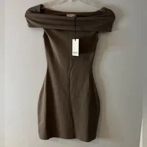 NWT Aritzia Taupe Off-Shoulder Mini Dress