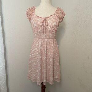 No Boundaries, Y2K dress, babydoll dress, gingham dress, pink checkered dress, daisy floral dress, cottagecore, coquette, soft girl, milkmaid dress, ruffle sleeves, tie front, vintage style, 2000s fashion, aesthetic dress, summer dress, picnic dress, fairycore, mall brand vintage, juniors dress, cap sleeve dress, empire waist dress