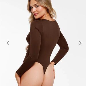 Figure-hugging long-sleeve bodysuit in rich brown with a strappy V-neck detail. Soft, stretchy fabric provides a smooth silhouette and comfortable fit. Versatile brown piece that pairs easily with skirts or jeans for day-to-night looks.