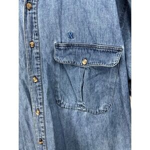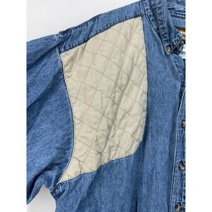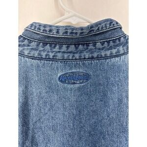Men's Remington denim range shirt has the quilted tan patch on the right front sleeve has the Remmington R on the embroidered front left chest front pocket on the front left chest Remmington also is embroidered on the back of the neck and it has a breathable mesh back size extra large measurements are in photos. This is gently used smoke free, pet friendly home overall good condition sold as is.