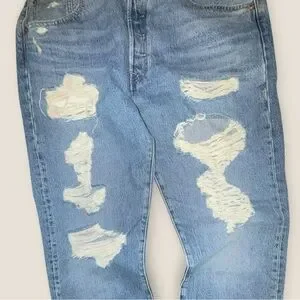 Levi’s 501 jeans in light wash denim with distressed details. Classic straight leg fit with button fly. Y2K-inspired look that pairs well with streetwear or everyday casual outfits.
