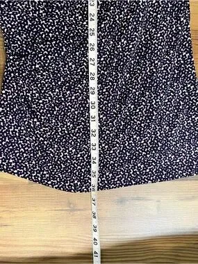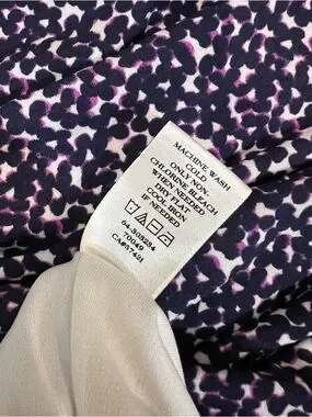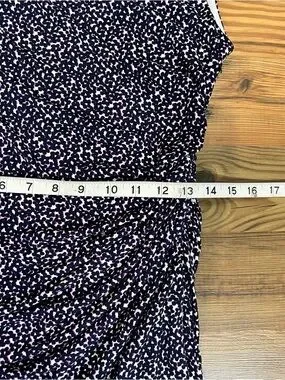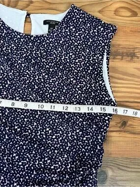 Sleek Ann Taylor sheath dress in navy with small white speck print. Cap sleeves and a crew neckline. Subtle side ruching for a tailored silhouette. Smooth, stretchy fabric that skims the body. Easy dress for office or events.
