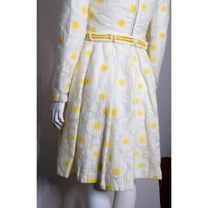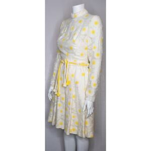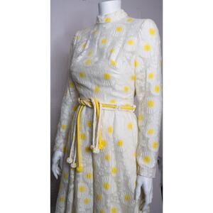 This dress is pure sixties / seventies sunshine. Bright yellow and white lace knit daisy floral printed dress. Mockneck. Long Sleeves. Fun crochet knot woven belt. Back Zipper. Lined. Handmade.