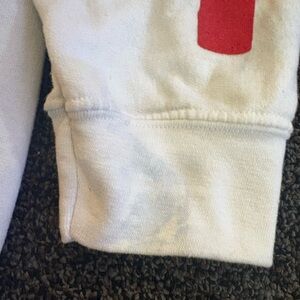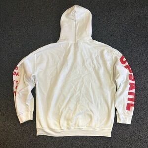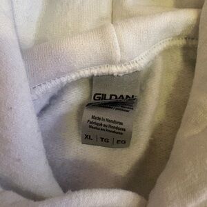 Classic Gildan pullover hoodie. White base with bold red text graphics on chest and sleeves. Front kangaroo pocket and drawstring hood. Casual streetwear style. Easy to pair with jeans or joggers.