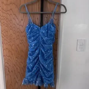 Chic blue mini dress with delicate lace. Features ruched detailing and spaghetti straps. Perfect for a night out.