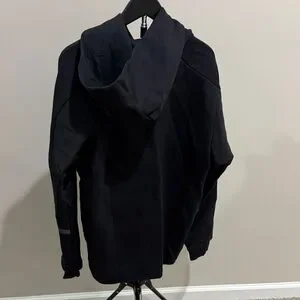 Sleek black performance jacket with full zip and hood. Water-resistant chest pocket with zipper. Reflective stripe accents on sleeves for visibility. Subtle adidas logo on chest. Lightweight, breathable for workouts and layering.