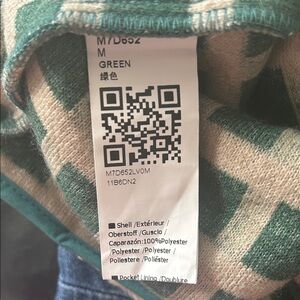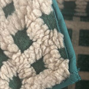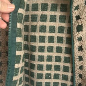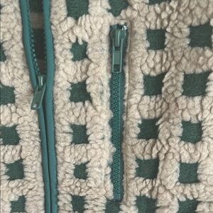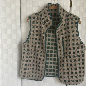 Soft beige sherpa vest with a dark green grid pattern and trim. Zip-front design for easy wear and a secure chest pocket for essentials. Lightweight and cozy layering piece that adds texture to outfits.