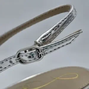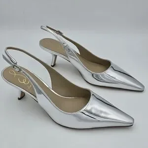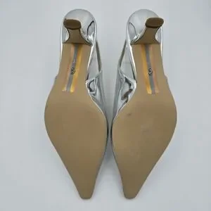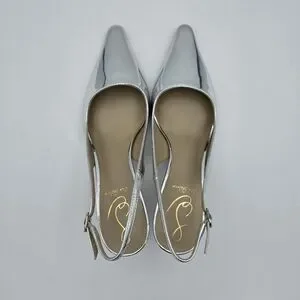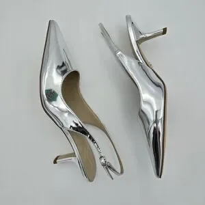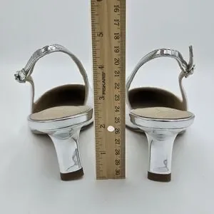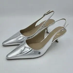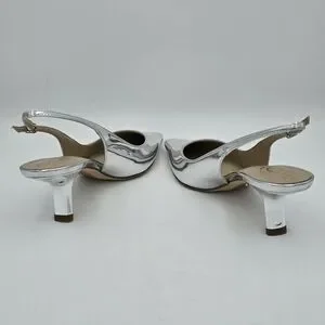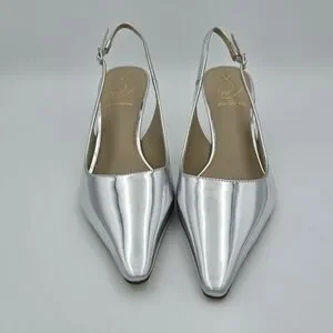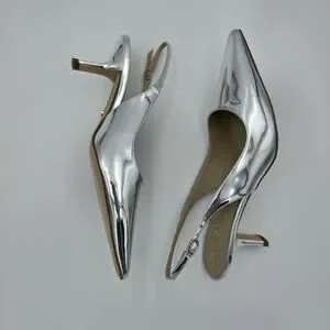 Sleek metallic slingback with pointed toe. Low kitten heel for subtle lift. Shiny silver finish for a modern look. Smooth leather-like upper and cushioned insole. Elegant and versatile for dressy occasions.
