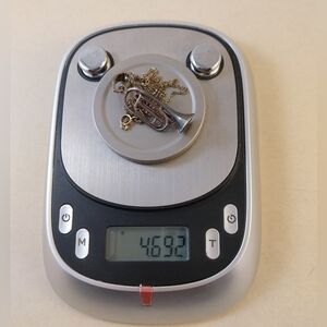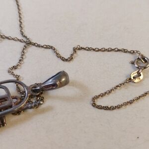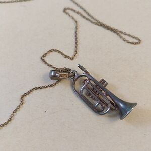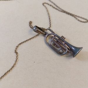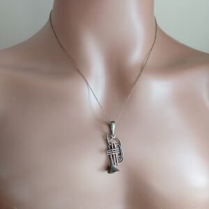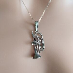 This elegant silver trumpet pendant necklace is perfect for music lovers. Its intricate design adds a touch of sophistication to any outfit.