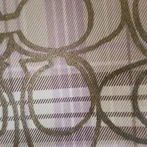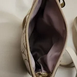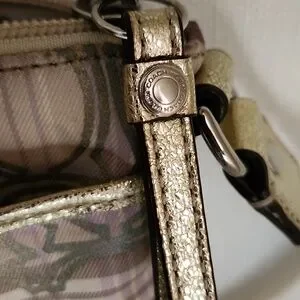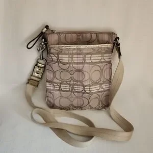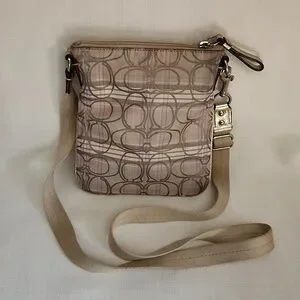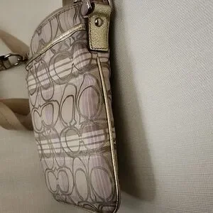 This small Coach crossbody bag has the signature C pattern on the outside. Colors are purples, creams and khakis. It has a fabric crossbody strap with silvertone hardware. There are gold leather accents on the straps, the front pocket and around the exterior of the bag. It has a zip top and purple fabric on the inside of the main pocket. There is also smaller pocket on the front with purple fabric inside. It measures 8 1/2" long and 7 1/4" across. There are a couple of small marks on the front as shown in photo #9, but otherwise it's in very good condition.