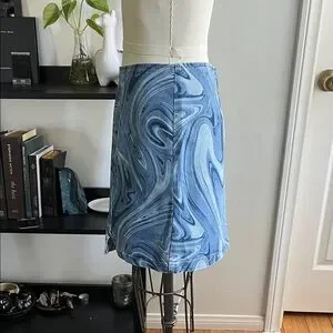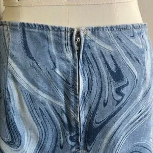 Super cute denim mini skirt from Wild Fable. It had a swirl pattern in blue denim and is a women's size 8 - definitely has stretch to it. There is a seam of center with a small "v" slit at the bottom and a back zipper that is brass colored. Like new, no visible signs of wear.