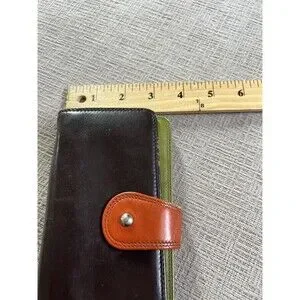 Color: Multicolor colorblock leather exterior with dark brown, olive green, tan, orange, and aqua accents.