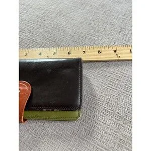 Wallet is pre-owned with moderate wear from prior use. Exterior leather shows rubbing, scratches, and small scuffs on the brown and green panels, edges, and tab strap, with some finish wear on the snap hardware. Interior leather and leopard-print lining show light creasing, scuffs on several colored card slots. Small tear near the photo ID slot as shown.