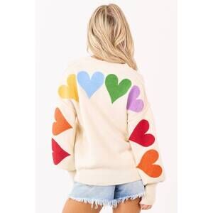 Introducing the Rainbow Heart Sweater by Mello, a playful addition to your wardrobe with its vibrant, textured heart patches ideal for a dinner party. This oversized sweater with long balloon sleeves is crafted from 52% Acrylic, 28% Nylon, and 20% PBT. Its drop shoulder design and banded ribbed trim offer a comfortable, laid-back fit. Closure: Pull-on.
