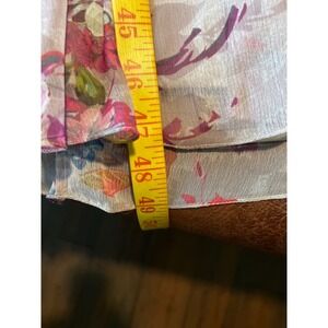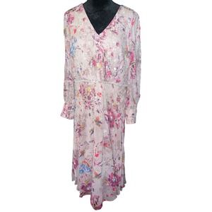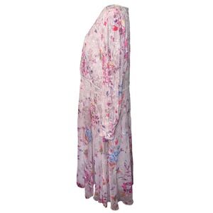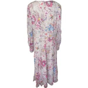 Mac Duggal floral chiffon midi dress showcases intricate hand-beaded sequins and embroidery over a romantic pink botanical print. Designed with a flattering wrap-style V-neckline and long sleeves with button cuffs, this elegant piece features a shimmering beaded waistband that defines the silhouette. The lightweight, airy fabric creates beautiful movement, making it an ideal choice for weddings, garden parties, or formal evening events. This dress is in excellent pre-owned condition.