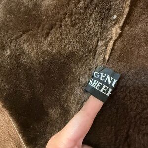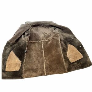 Rich brown suede exterior with plush shearling trim. Button-front closure and front pockets. Warm, structured silhouette. Versatile for cooler days.