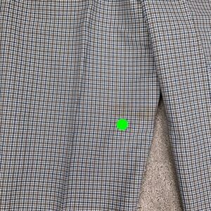 Light stain on inner leg. Vintage-style trousers feature a classic micro-check pattern in a versatile blue, tan, and white color palette. Designed with a flat front and a subtle flare at the leg, these pants offer a timeless silhouette suitable for both casual and semi-formal occasions. The fabric has a substantial feel, typical of mid-century tailoring, and includes functional front slash pockets and rear welt pockets. A faint stain is present on the back of the left leg as indicated by the green marker.