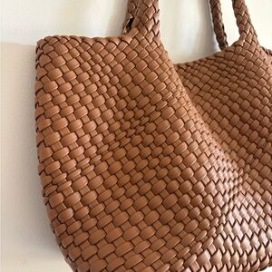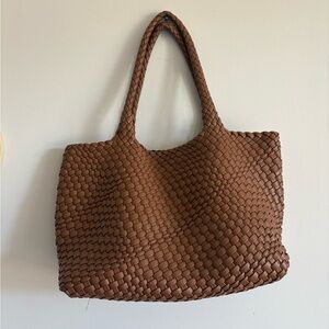 Spacious brown woven tote with sturdy braided handles. Soft, flexible construction for everyday carry. Simple, timeless design that complements casual and polished outfits. Lightweight and easy to style with neutral tones.