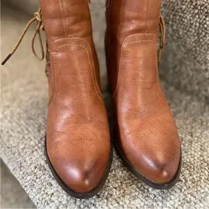 Chic tan ankle boots with decorative lacing and a stacked block heel. Side zipper for easy wear. Soft faux leather upper with stitched detailing. Versatile style for everyday outfits.