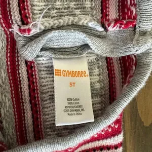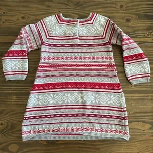 Pre-owned Gymboree girls’ long-sleeve dress in size 5T with a gray and red Fair Isle knit pattern. Made of 100% cotton. Features a round neckline with two small gray buttons at the back. Classic winter stripe and snowflake-style motifs. Good condition with no notable flaws.
