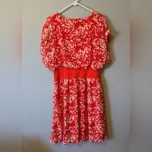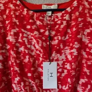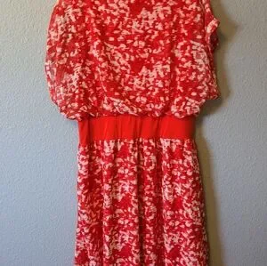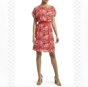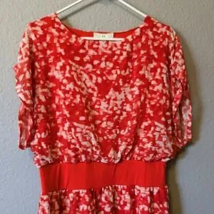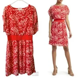 NWT H by Halston Coral Red Brush Stroke Dress Cap Sleeves Knee Length Sz. M