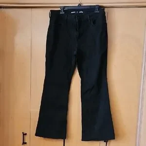 High-rise flare silhouette from Old Navy. Black denim with a black button and gold zipper front. 4 pockets. Easily dressed up or down. Sleek, modern look with slight flare at bottom of leg that pairs easily with tops and shoes. 69% cotton, 30% polyester, 1% elasthanne. 29"inseem, flare bottom 10.5" flat.
