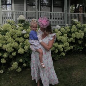 Soft floral midi dress with ruffle shoulder details. Light pink and pastel floral print for a feminine look. Lightweight, breezy fabric ideal for daytime events. Easy slip-on style for comfortable wear.