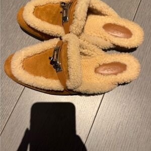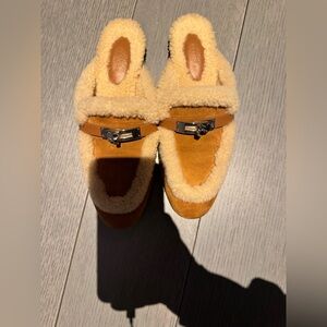 Hermes mule loafers in tan suede. Plush shearling trim and lining. Silver-toned hardware detail. Slip-on style for easy wear.