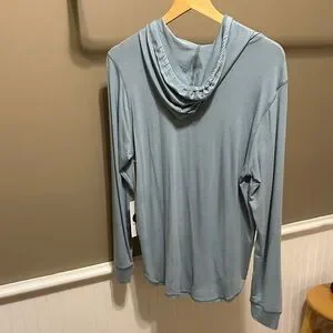 Light blue men's hooded long-sleeve shirt with a relaxed fit. Soft, breathable fabric for everyday comfort. Adjustable drawstring hood for added coverage. Clean, versatile style that pairs well with casual looks.