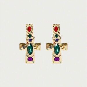 Gold-tone women's drop earrings featuring a prominent green marquise center stone with accent purple, blue, red and yellow crystals. Lightweight statement design that adds color and sparkle to any outfit. Secure post backs for comfortable wear. The green, purple and multicolor gems create a bold, fashionable look.
