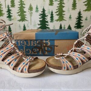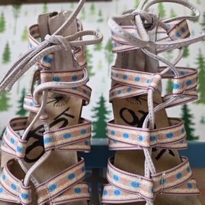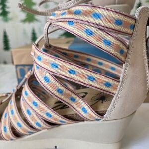 Way Out in tobacco is a printed, lace up ghillie tie formed for fashion and function. The tribal printed straps give the show a distinctly outdoor vibe while the back zipper make this lace up a breeze to get on and off. Enjoy subtle color highlights on the tobacco with a toffee toned wrapped wedge and cork footbed.