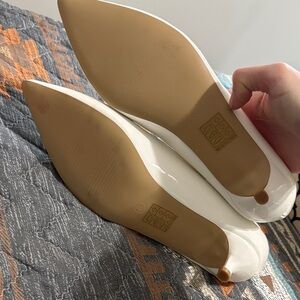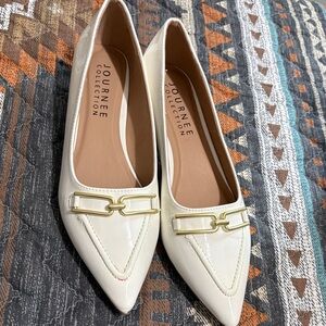 Sleek cream patent pointed-toe flats by Journee Collection. Gold-tone decorative bit across the vamp. Low-profile, slip-on style for everyday wear. Polished look pairs with dressy or casual outfits.