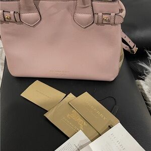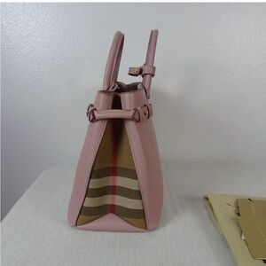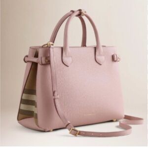 Smooth powder pink Derby leather satchel, small banner Tote.Dual top handles and adjustable shoulder strap. Gold-tone hardware accents. Striped fabric side panels for signature detail. Structured, refined silhouette.