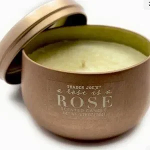 Trader Joes Rose Scented Candle in a unique and gorgeous rose gold tin.