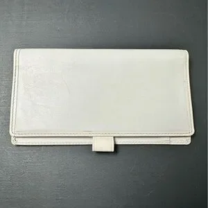 Coach Leather slim bifold checkbook cover wallet in white leather with pen loop. Clean, minimalist design with stitched edges. Simple snap tab closure. Great everyday accessory. Beautiful condition!