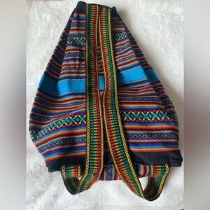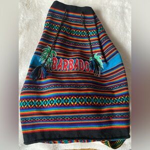 Vibrant colourful woven backpack. Features Barbados graphic. Drawstring closure. Two shoulder straps.